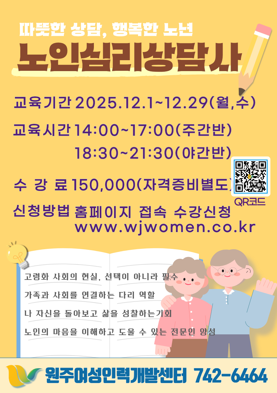 노인심리상담사 교육프로그램을 통해 마음을 돌보는 힘, 함께 공감하는 따뜻함을 길러보세요.