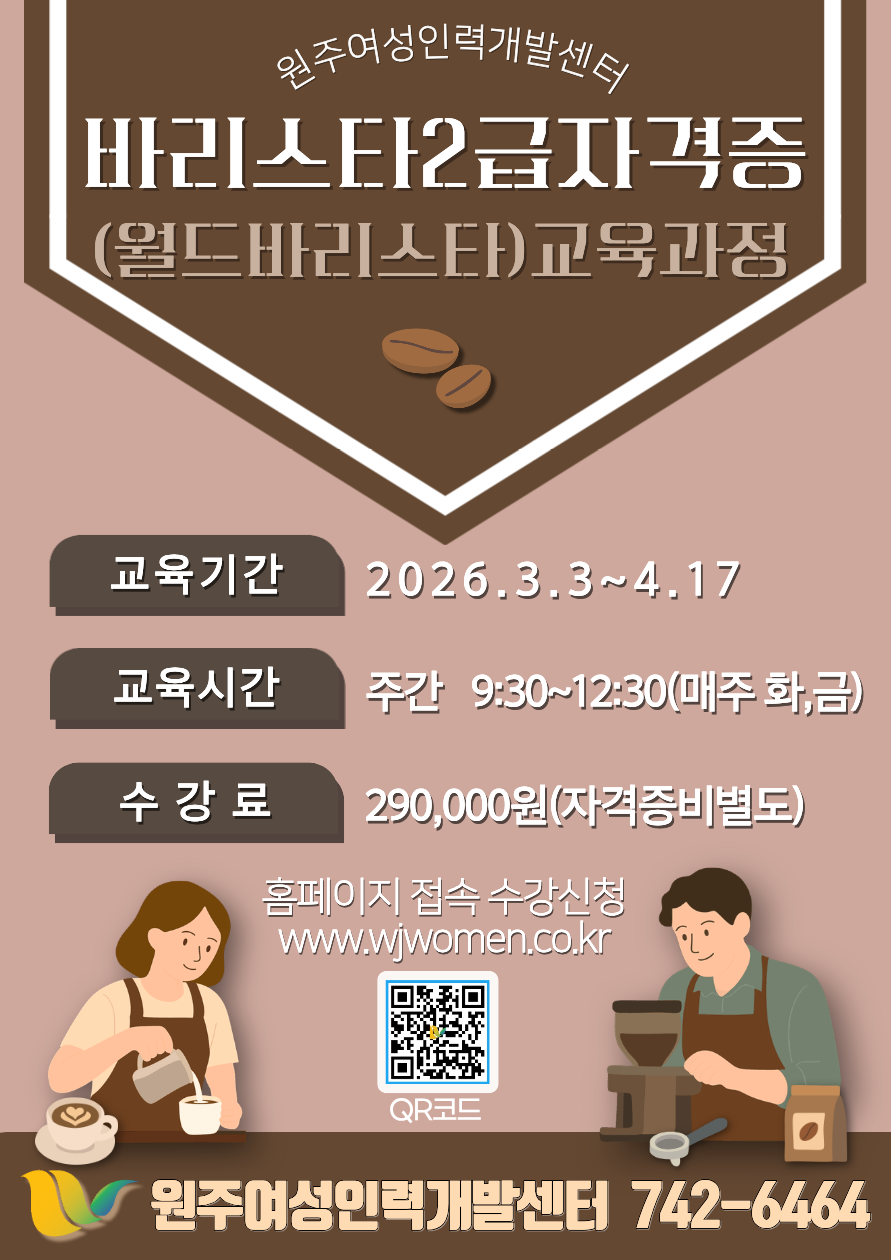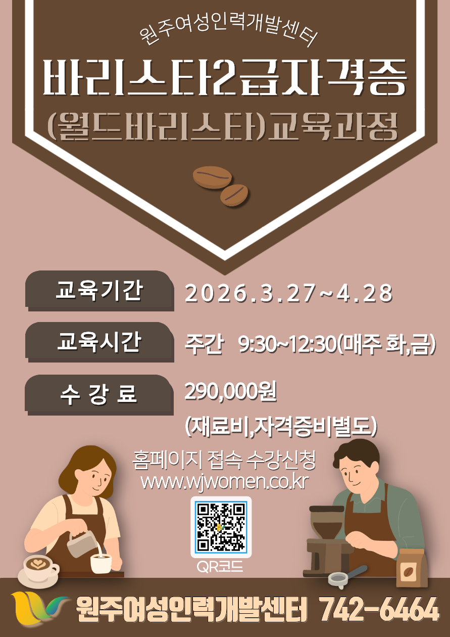 원주여성인력개발센터에서는 커피 이론부터 실습까지 체계적으로 배우는 바리스타 2급 자격증(월드바리스타) 과정을 개설합니다.